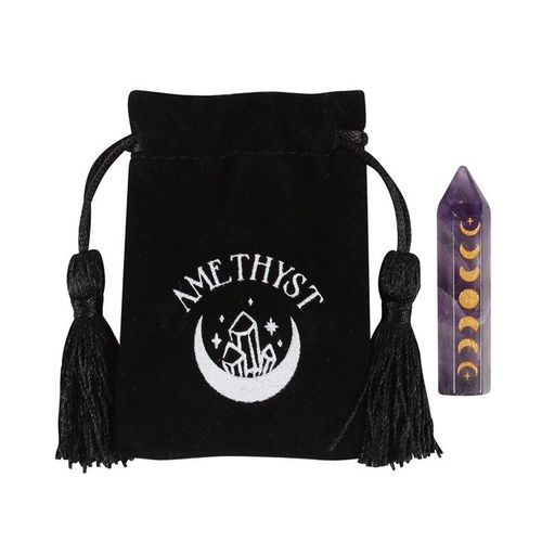 This beautiful amethyst crystal point is perfect in size for travel altars, desk decor or taking on the go for extra protection. Features a gold-tone moon phase engraving and comes with a matching drawstring bag for storage and safe-keeping.  Product Dimensions: H5cm x W1.2cm x D1.1cm  Packaged Dimensions: H8cm x W5.5cm x D1.4cm