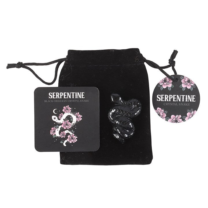Poised, ready to strike, this stunning black obsidian crystal snake offers an aura of protection, healing and purification. Presented in a black velvet drawstring pouch, this crystal can be used as a tool for welbeing when in need of support or reassurance.