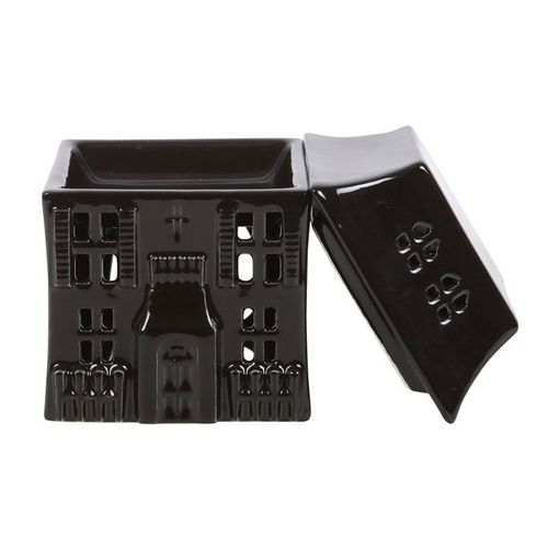 Embrace the 'spirit' of Halloween year-round with this spookily stylish haunted house oil burner. When a lit tealight is placed inside, the flickering flame casts eerie shadows, creating a bewitching atmosphere. A great piece for those who appreciate unconventional style and gothic decor. Recommended for use with fragrance oil diluted with water. Do not use more than one tealight and remove lid when in use.
