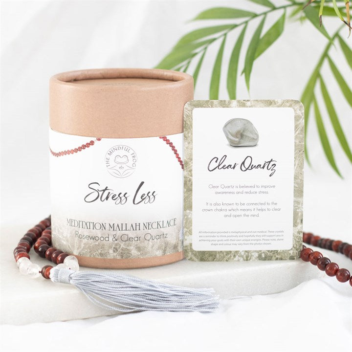 Crafted from rich, warm rosewood beads and intelaced with radiant Clear Quartz stones, this elegant necklace features 108 beads — a traditional number in Mallah necklaces, symbolizing spiritual journey and mindfulness — and is finished with a decorative tassel. The Clear Quartz, renowned for its cleansing and clarifying properties, is associated with all the chakras, particularly known for its ability to reduce stress and enhance mental clarity. It is believed to amplify positive energy and thought, encouraging calmness and serenity in the wearer.  A Mallah, or Mala, necklace is a string of beads traditionally used in meditation and prayer in various spiritual practices including Buddhism and Hinduism. Each bead represents a repetition of a mantra or prayer, aiding in focus and spiritual contemplation. To use simply hold the necklace in one hand and move from bead to bead whilst focusing on mindful breathing and repeating an intention. The necklace can be worn throughout the day as a reminder of these intentions. Each Mallah Necklace is presented in a beautifully designed box, accompanied by a corresponding information card, making it an ideal and thoughtful gift for a loved one who seeking to alleviate stress, enhance mental clarity, and promote inner peace.